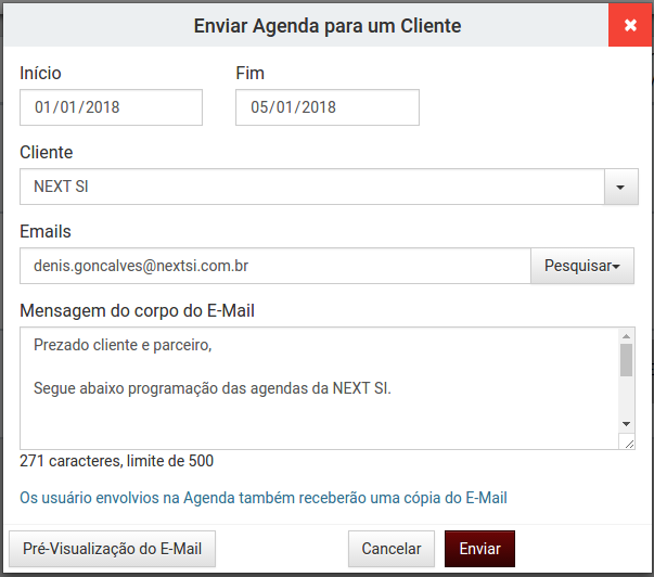 Esta funcionalidade possibilita gerar um e-mail com os eventos programados para um cliente em um período definido pelo usuário. Serão sugerios os e-mails do cliente (campo E-mail de recebimento da agenda existente no cadastro de clientes).