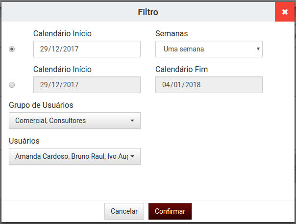 Defina o período a ser realizada a listagem de eventos, informe o dia inicia e seu término. Também é possível filtrar por usuários e grupo de usuários.