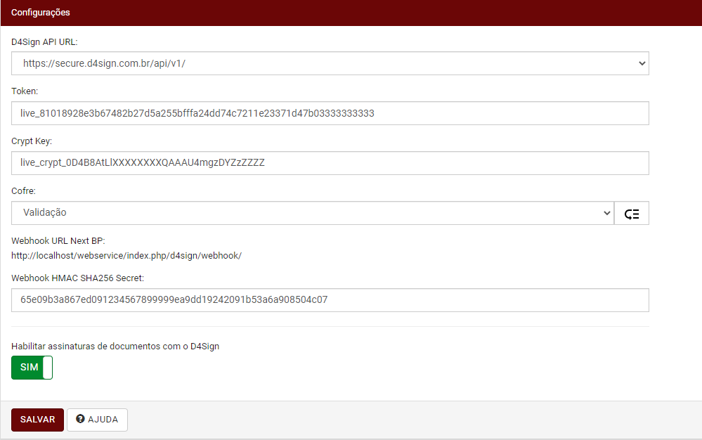 Webhook HMAC SHA256 Secret: Chave de segurança para validar se o usuário tem permissão para consumir a API e permitir o acesso dos Webhooks (disponibilizado pelo D4Sign)