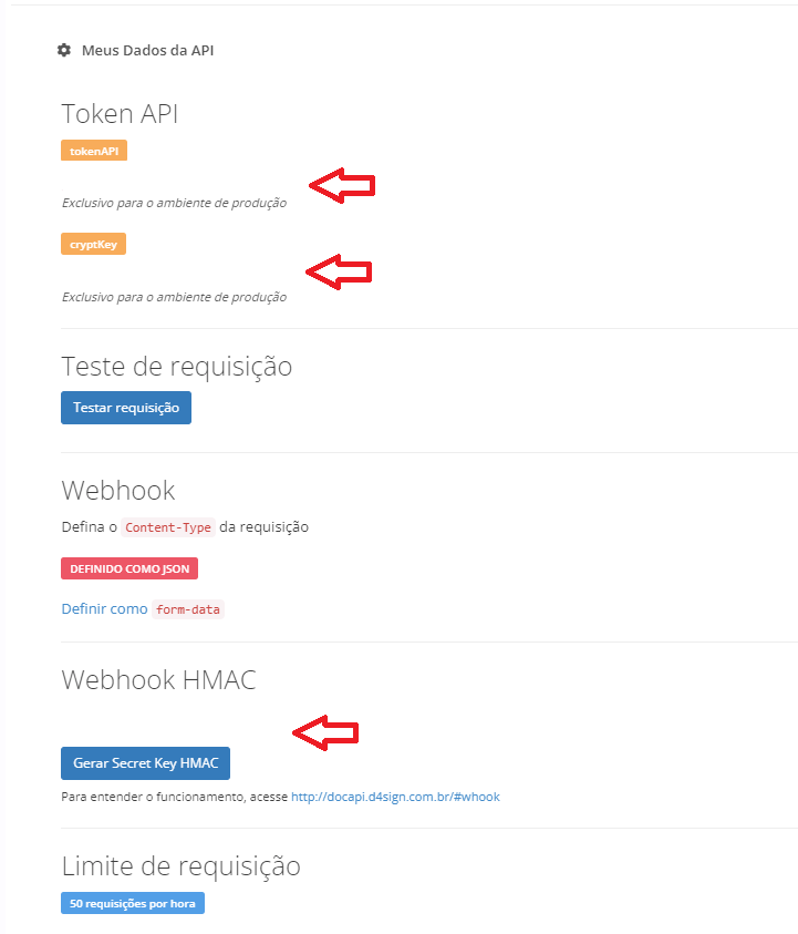 Para obter um Token, Crypt Key e HMAC o usuário deverá enviar um email para suporte@d4sign.com.br, passando os dados da conta do titular para que a liberação dessas informações sejam disponibilizadas. Posteriormente para acessá-las, basta acessar um dos endereços abaixo: