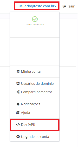 Após logar no sistema, clique sob o email do usuário que fica no canto superior a direita e acesse a opção Dev(API), e com isso serão listadas todas as informações vinculadas a conta.
