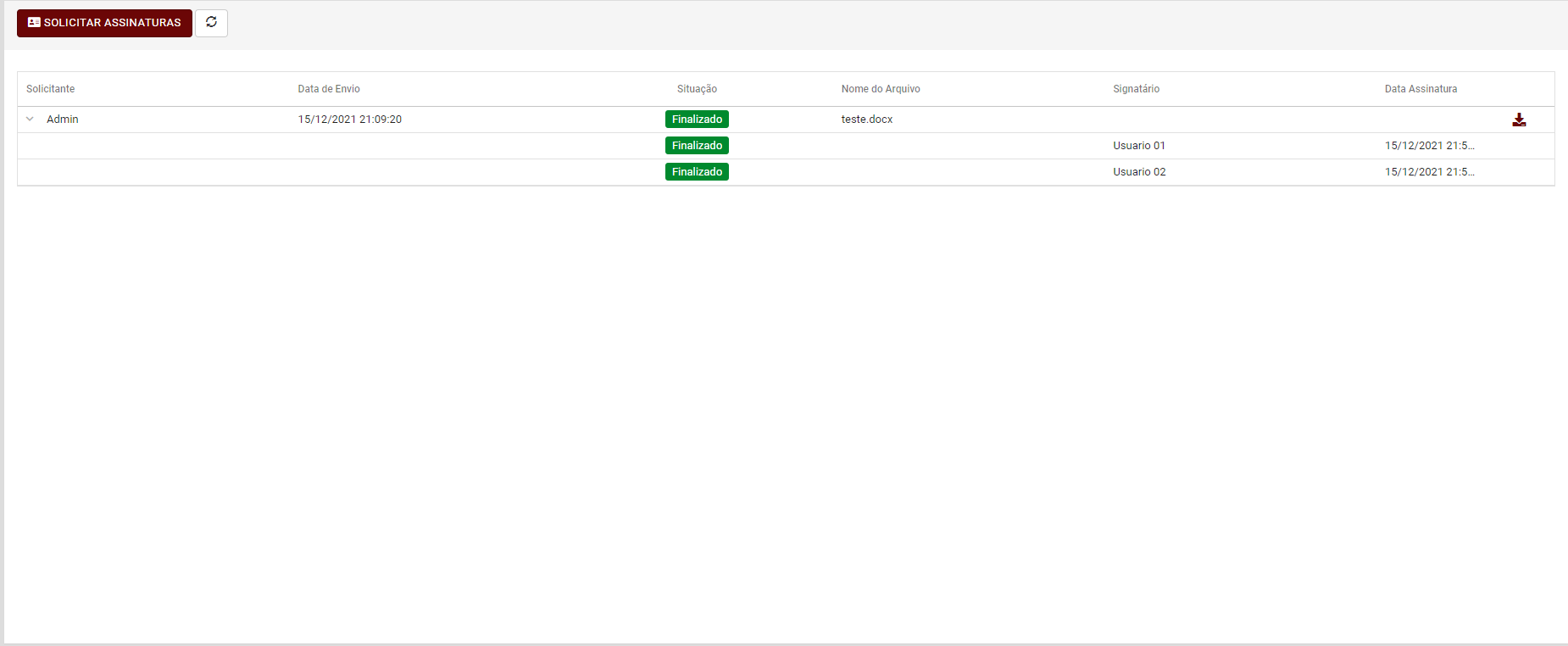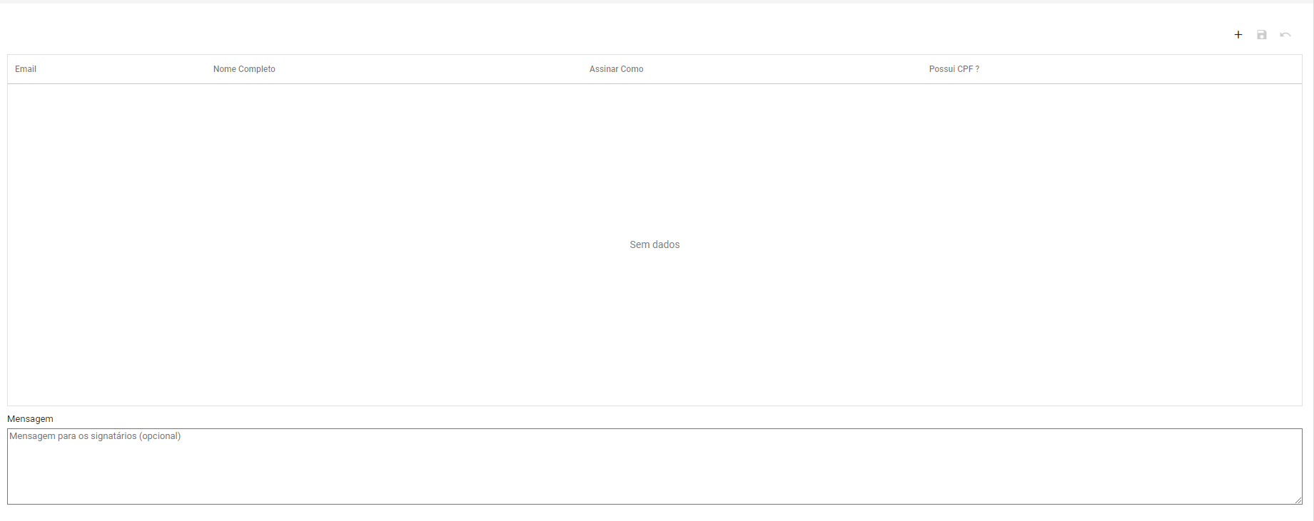 Essa tela também possibilita ao usuário um botão para inserção dos signatários para o documento (Botão Solicitar Assinaturas). Clicando nesse botão o usuário irá se deparar com a tela abaixo: