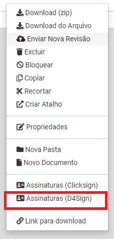 Caso a opção "Habilitar assinaturas de documentos com o D4Sign" esteja igual a "Sim", então ao entrar no módulo GED e pressionar o botão direito em cima de um documento será exibido o menu "D4Sign (Assinaturas)".