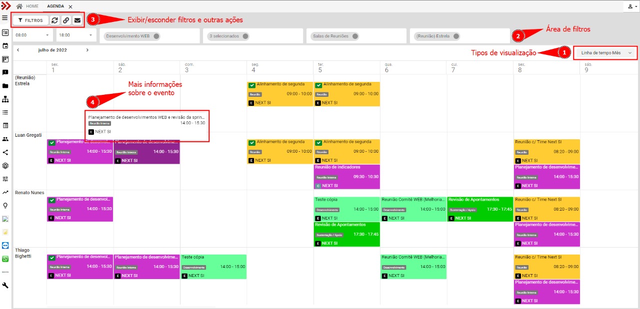 Os filtros também receberam algumas mudanças. Agora eles estão disponibilizados diretamente na tela, sem a necessidade de abrir uma janela para alterá-los. As alterações realizadas nos filtros são refletidas na agenda em tempo real. Um filtro de horas também foi adicionado para alguns tipos de visualizações. É possível exibir e esconder os filtros na tela, para deixar a visualização mais limpa.