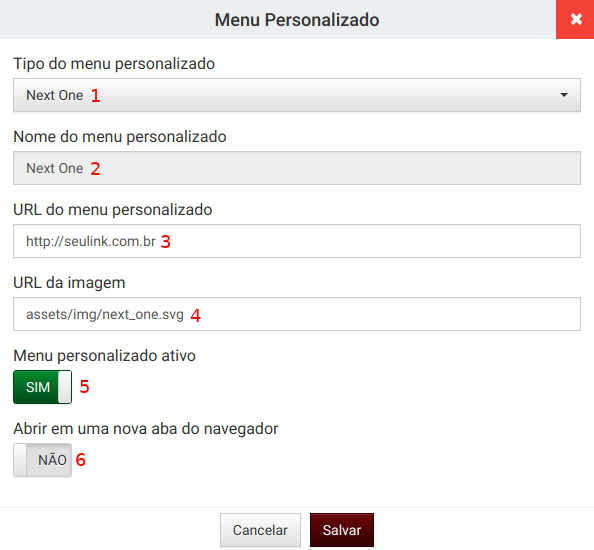- Informe o tipo do menu personalizado, existem 3 tipos, "Next One", "Next BA" e "Outros" cada um deles tem um icone padrão que irá aparecer no menu (que pode ser alterado).
