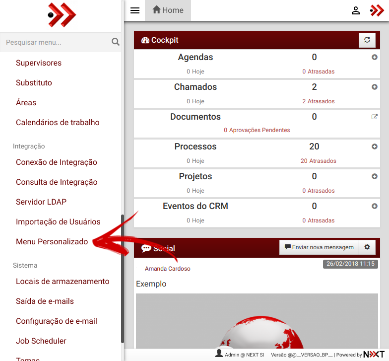 No menu procure a opção "Menu Personalizado", é necessário ter a devida permissão concedida ou ser um usuário administrador.
